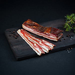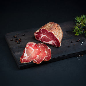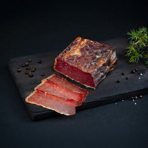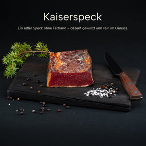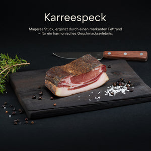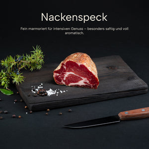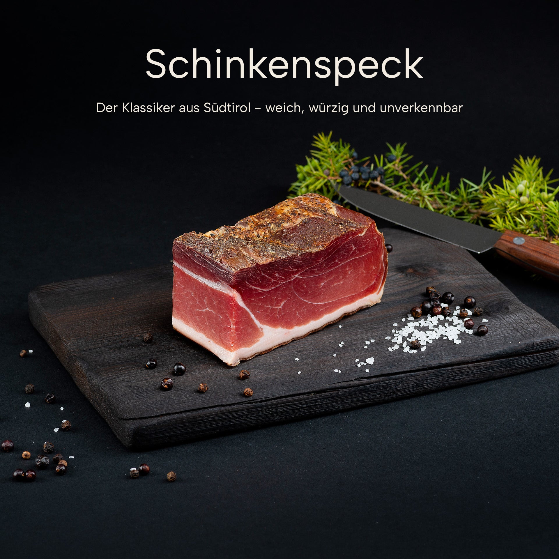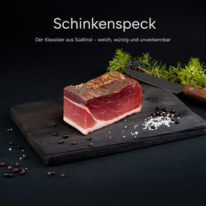 Hergestellt wird der Speck in einer Südtiroler Familienmanufaktur mit über 70 Jahren Erfahrung.